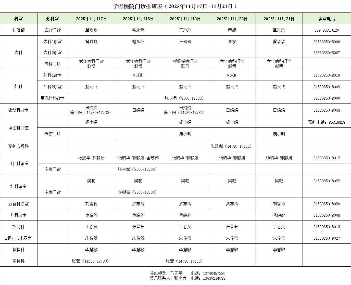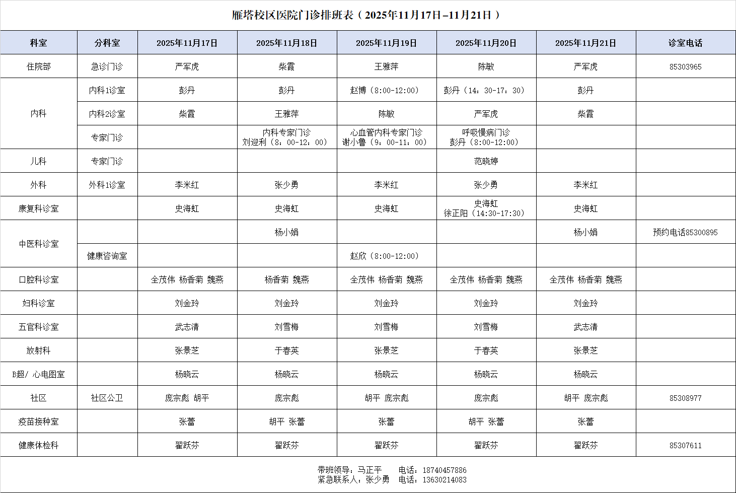 医院门诊安排(11月17日-11月21日)