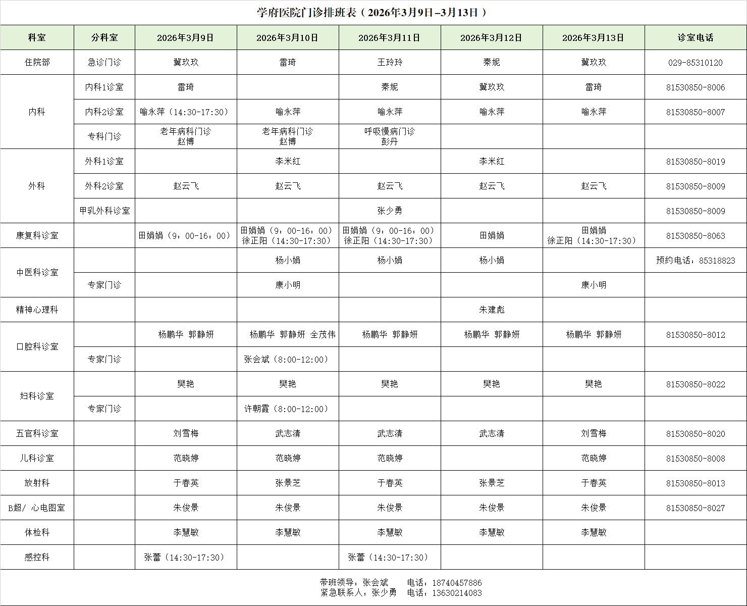 (1)各门诊科室每周工作日 上午8:00-12:00,下午2:30-5:30